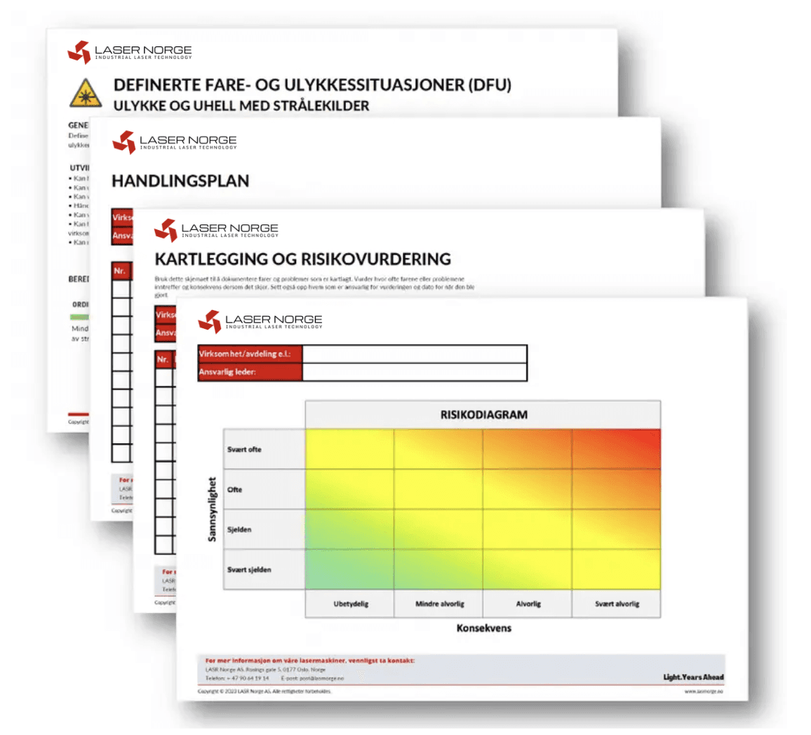 Alle kunder hos LASER Norge mottar komplett HMS-dokumentasjon, inkludert sjekklister, risikovurderinger, kartlegging og handlingsplaner, som kan integreres direkte i bedriftens eksisterende internkontroll- og HMS-system.